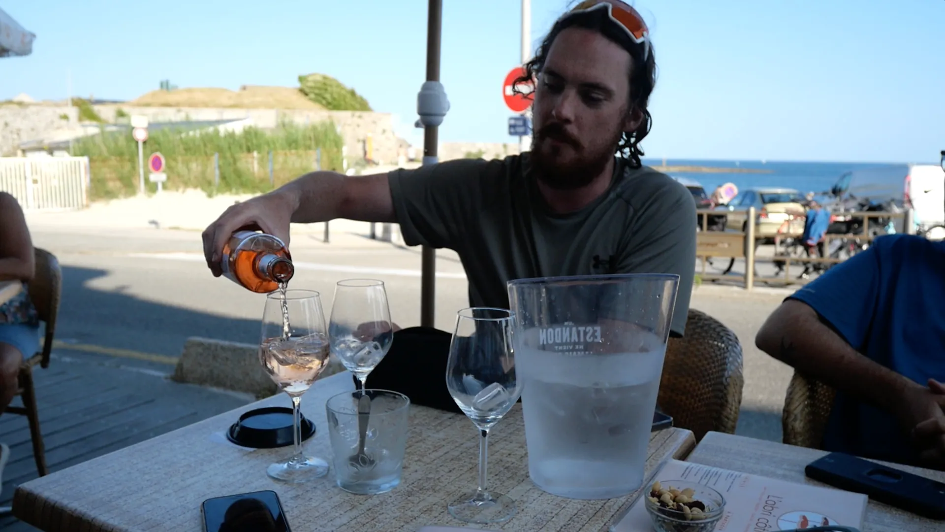 L’après-midi se déroule sans encombre, entre champs, rivières et petits reliefs. Arrivée à Lorient en fin de journée : une douche rapide à l’hôtel et on repart aussitôt vers la plage de Locqueltas, à Larmor-Plage. Le soleil tape encore, l’eau est fraîche, la baignade parfaite. On s’installe ensuite en terrasse à “L’Abri Côtier” pour un verre bien mérité, les pieds encore sablonneux.