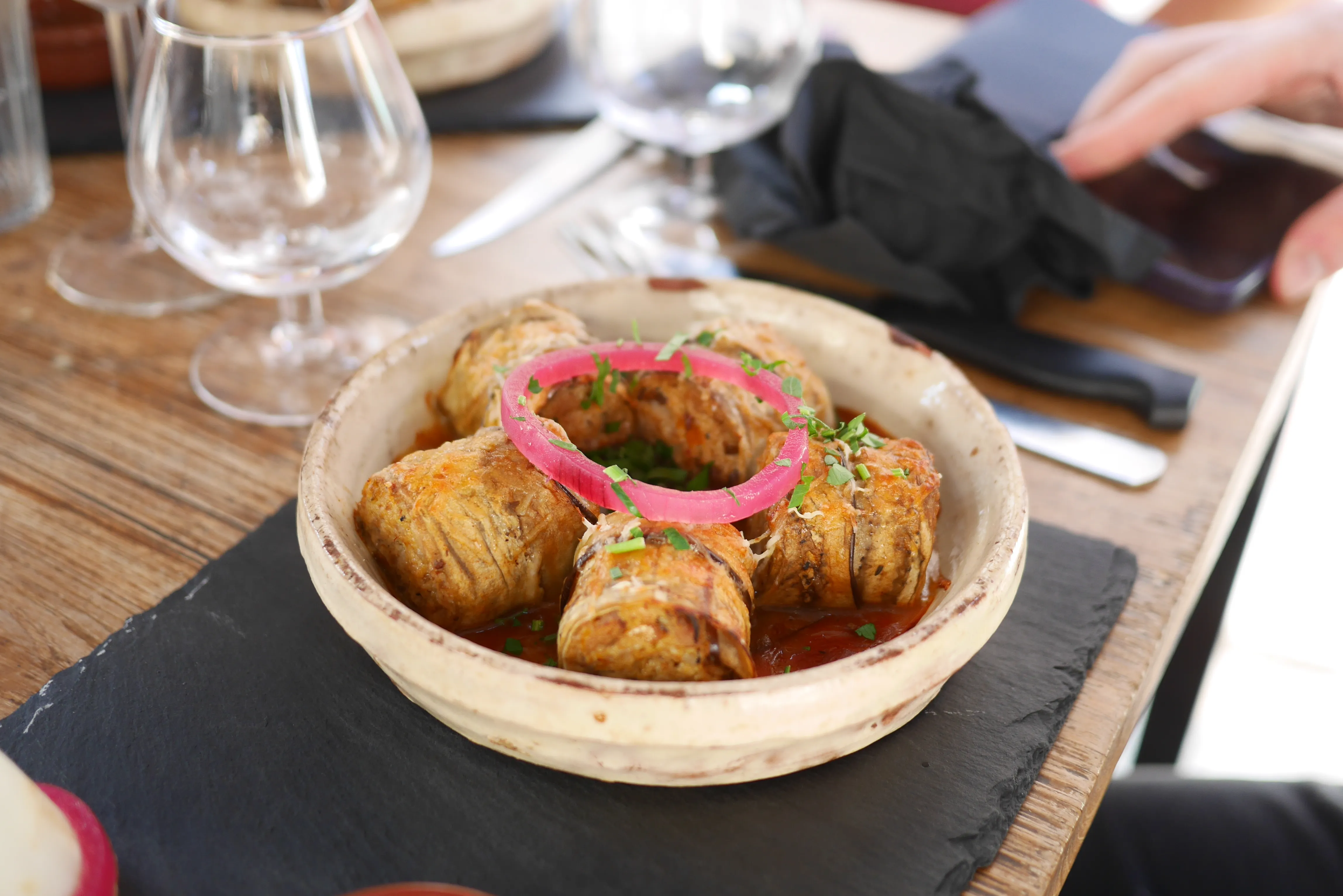 Déjeuner au Pas Sage, une adresse de tapas très quali, située juste en dessous de la Cité. Bonne nouvelle et hasard du calendrier : le gérant nous annonce qu’on tombe pile le bon jour : le soir même, un événement organisé par l’AOP Minervois se tient dans la rue du restaurant. On décide qu'on reviendra le soir même gouter le cassoulet en même temps que les vins de la région.